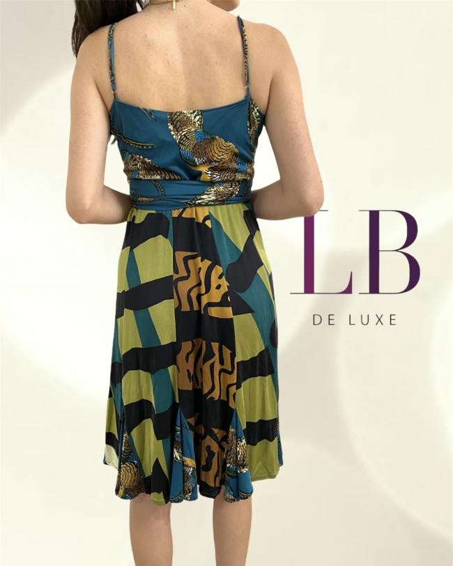 ORIGEM UK – Confeccionado em 100% seda. No busto, existe um tecido sobreposto como se fossem duas faixas de cada lado que vão afinando e você coloca cada uma por dois passantes de linha turquesa que está nas laterais e faz amarração do jeito que você quiser. Dá um charme especial ao modelo. As alças são reguláveis. O modelo é soltinho e evasé, com leves pregas na barra dando ainda mais movimento. Tamanho na etiqueta UK=10, US=6, mas confira as medidas aproximadas: comprimento = 85 cm, busto = 86 cm, cintura = 84 cm, quadril = 90 cm. Todo assinado. RN # 116572, estampa lindíssima. Preço na loja, R$ 1.990,00.