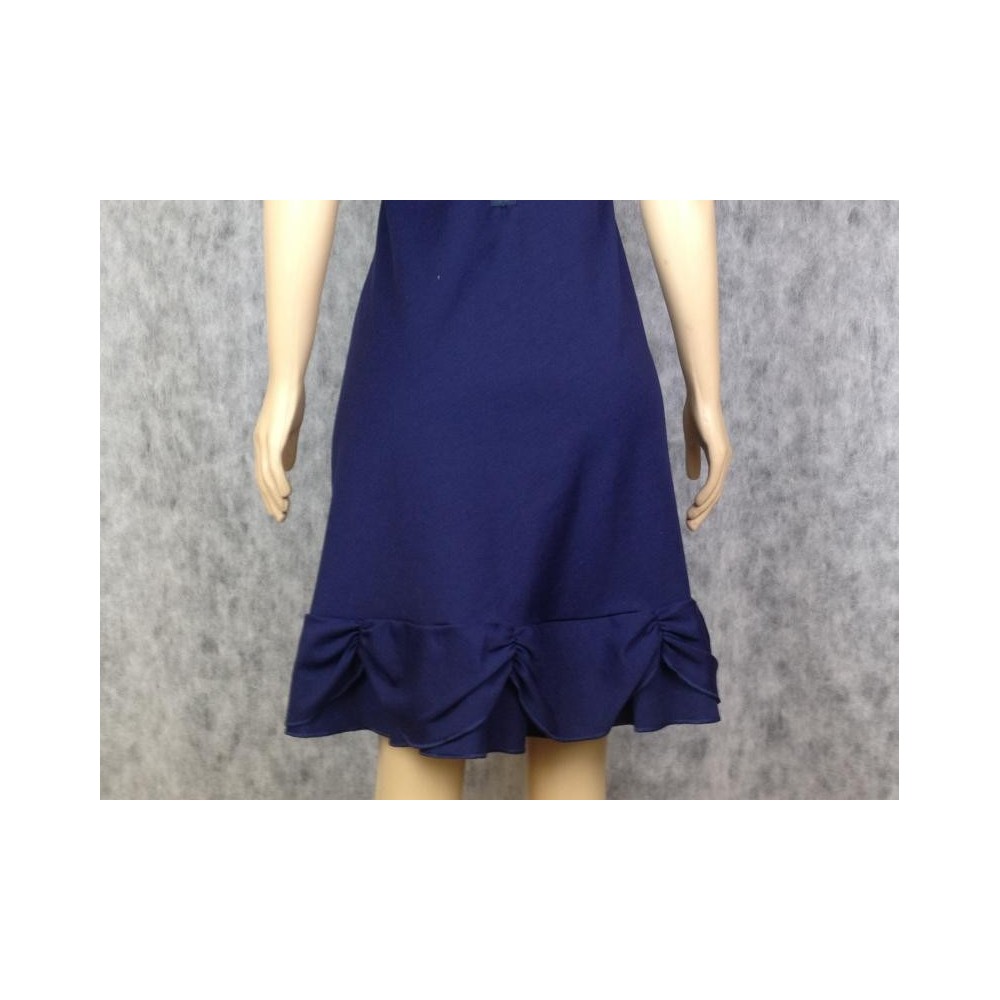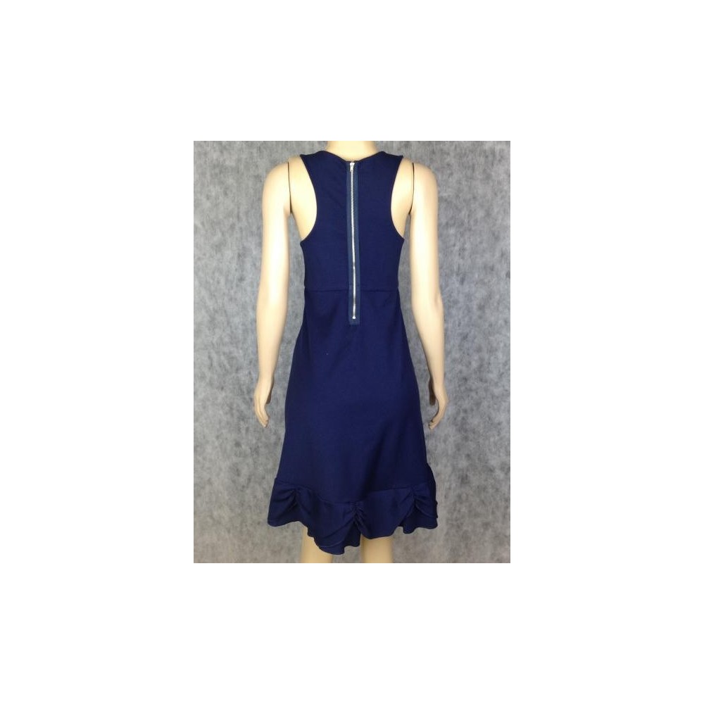 Vestido azul marinho com elastano, barra com babado e drapeado e fechamento com zíper aparente atrás. Etiqueta G, veste 44. Modelo nadador, zíper nas costas, nova com etiqueta.