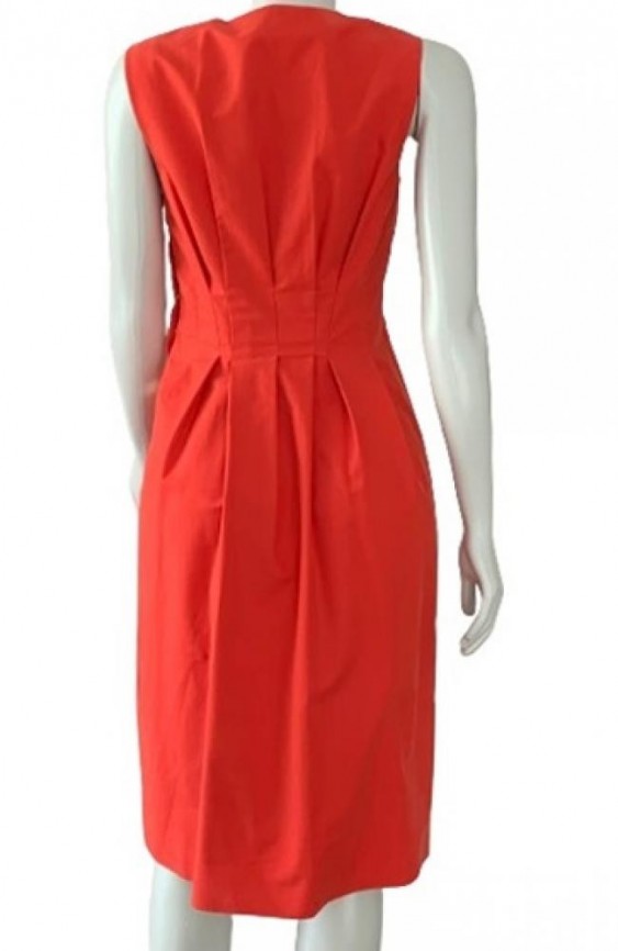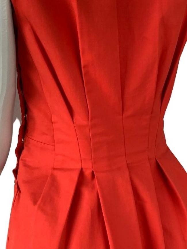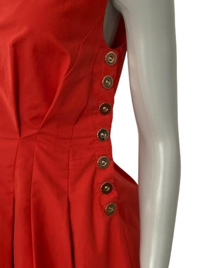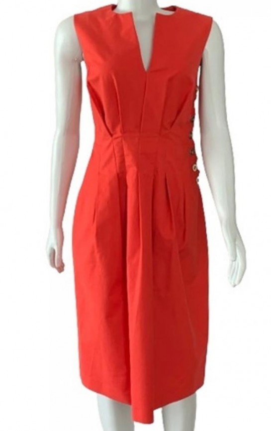 ORIGEM ITÁLIA – Confeccionado em tecido com 97% algodão e 3% elastano. Botões de pressão na lateral, evasé cm pregas, tamanho midi. Tamanho 40 na etiqueta, mas veste 38 no Brasil. Medidas aproximadas: comprimento = 108 cm mais 4 de bainha; busto = 78 cm; cintura = 74 cm; quadril = 88 cm. Preço na loja, aprox R$ 9.000,00. Aparência perfeita.