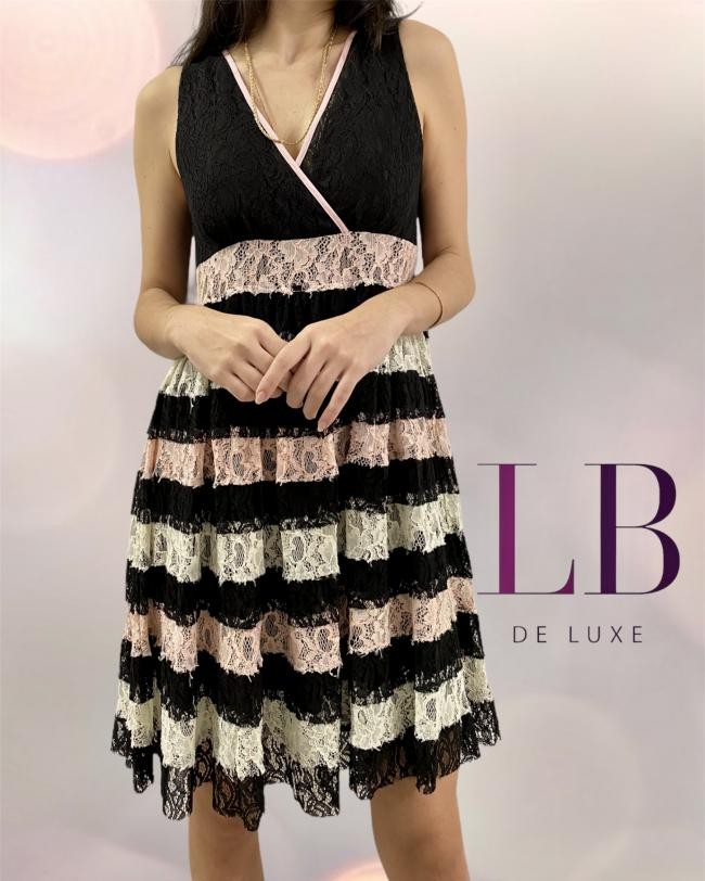 ORIGEM ITÁLIA – Sem etiqueta de composição, mas tem elastano. Confeccionado em tecido bordado e uma renda preta, rosa e off-white. Forro preto. Zíper atrás, evasé (vai alargando a partir da cintura). Tem um cristal aplicado no ombro. Medidas aproximadas: comprimento = 89 cm, busto = 80 cm, cintura = 84 cm, quadril = 114 cm.