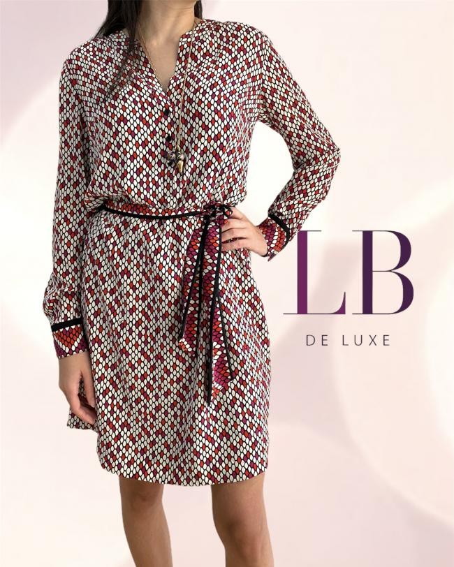 Vestido assinado, acompanha uma combinação preta avulsa da mesma marca com etiqueta. Não tem etiqueta de composição, mas parece ser seda ou viscose. Todos os botões tem a marca impressa, inclusive os das mangas. Solto, mas tem passantes no vestido com linha trançada. Medidas aproximadas: comprimento = 93 cm mais 3,5 de bainha, busto = 96 cm, cintura = 90 cm, quadril = 106 cm. Em tons de preto, off-white, abóbora e rosa. Impecável!